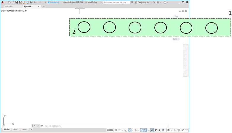 Po włączeniu zmiennej systemowej SELECTIONOFFSCREEN obiekty, które są poza ekranem (punkt 1 na rysunku jest poza głównym ekranem), są uwzględniane w wyborze.