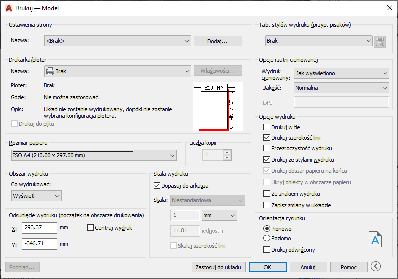 Podczas drukowania z karty Model drukuje cały obszar rysunku zdefiniowany przez granice siatki. Jeśli bieżąca rzutnia nie wyświetla widoku planu, to opcja ta działa tak samo jak opcja Zakres.