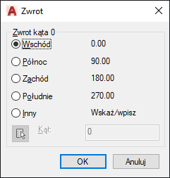 Ustala kierunek kąta zero. Podane opcje wpływają na wprowadzanie kątów, format wyświetlania i wprowadzanie współrzędnych biegunowych, walcowych i sferycznych.