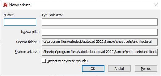 Określa numer arkusza. Zaleca się, aby podczas tworzenia pierwszego arkusza nie wpisywać numeru arkusza. Domyślnie nazwa rysunku i nazwa układu nowego arkusza będą numerem arkusza wraz z tytułem arkusza.