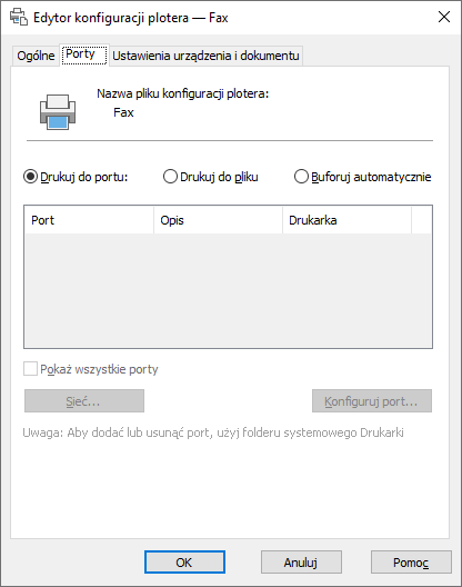 Wyświetla listę i opisy dostępnych portów lokalnych i sieciowych. Jeżeli port jest portem sieciowym, wyświetlana jest także nazwa drukarki sieciowej.