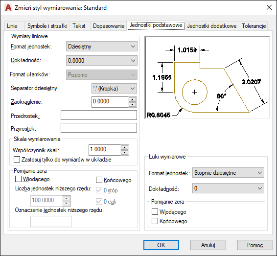 Ustala format i dokładność podstawowych jednostek wymiarowania oraz ustala przedrostki i przyrostki dla tekstu wymiarowego.