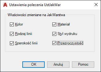 Zmienia nadpisania właściwości koloru, rodzaju linii, szerokości linii, materiału, stylu wydruku i przezroczystości dla wybranych obiektów i wstawionych bloków na odblokowanych warstwach na JakWarstwa.