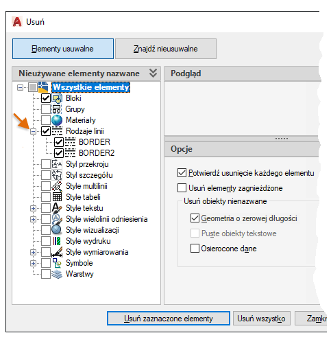 Aby usunąć wszystkie rodzaje linii bez odniesień, wybierz Rodzaje linii.