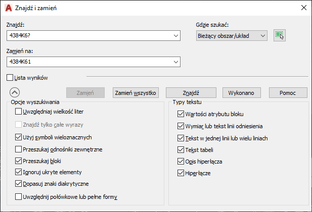 Jeśli na przykład chcesz zmienić podpis wszystkich podobnych części na rysunku na 4384K61, wprowadź 4384K6? w polu Znajdź i 4384K61 w polu Zamień na.