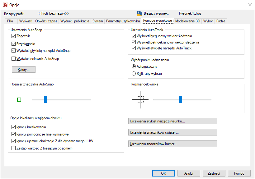Steruje ustawieniami związanymi z zachowaniem funkcji AutoTrack ™ , które jest dostępne, gdy włączone jest śledzenie biegunowe lub śledzenie lokalizacji względem obiektów (zobacz USTAWIENIARYS).
