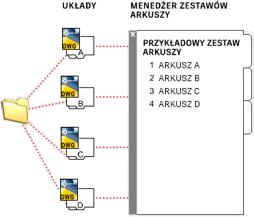 Za pomocą Menedżera zestawów arkuszy można zarządzać wieloma rysunkami jako zestawami arkuszy: