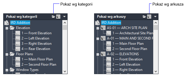 Na karcie Lista arkuszy można łączyć arkusze w zbiory zwane podzestawami. Na karcie Widoki arkuszy można łączyć widoki w zbiory zwane kategoriami.
