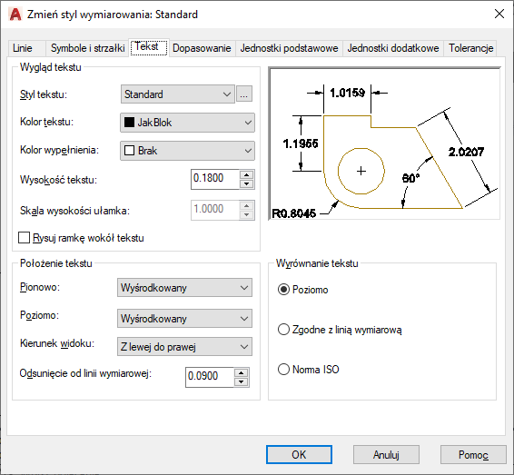 Jeśli styl tekstu określony na tej karcie posiada stałą wysokość tekstu, zastąpi ona wprowadzoną tutaj wartość wysokości tekstu. Jeśli wysokość tekstu wymiaru ma być ustawiona tutaj, należy się upewnić, że wysokość dla stylu tekstu jest ustawiona na 0. Więcej informacji na temat ustawiania wysokości tekstu dla stylów tekstu można znaleźć w opisie polecenia STYL.