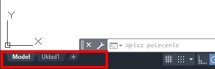Uwaga: Można przełączać się między różnymi układami a kartą Model, klikając kartę na dole obszaru rysunku. Karty układu i karta modelu są wyświetlane tylko po wybraniu opcji Wyświetlaj karty Układ oraz Model na karcie Wyświetlanie (okno dialogowe Opcje).