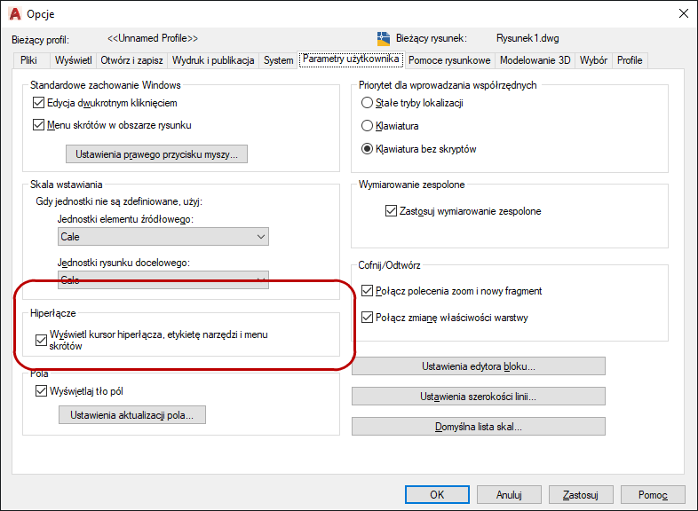 Włącz wyświetlanie informacji o hiperłączu na karcie Parametry użytkownika w oknie dialogowym Opcje.