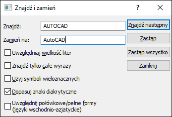 WTEKST (polecenie) Wyszukiwanie : W edytorze tekstu lub z poziomu menu skrótów polecenia WTEKST wybierz opcję Znajdź i zamień