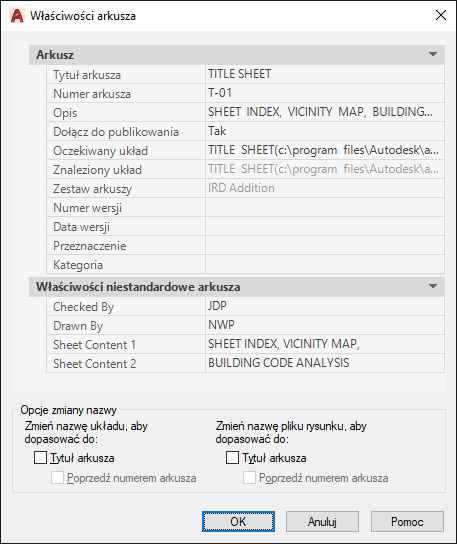 Wyświetla właściwości wybranego arkusza. Wyświetla również właściwości niestandardowe, jeśli istnieją. Można wprowadzić nową wartość, aby zmodyfikować każdą właściwość arkusza. Opcja Oczekiwany układ to ścieżka i nazwa pliku rysunku, gdzie arkusz został zapisany. Opcja Znaleziony układ to ścieżka i nazwa pliku rysunku, gdzie dany arkusz został znaleziony. Jeśli te ścieżki są różne, można zmodyfikować ścieżkę i nazwę pliku w opcji Oczekiwany układ. Operacja ta ponownie ustala powiązanie arkusza z zestawem arkuszy.