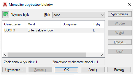 Pozwala edytować definicje atrybutów w blokach, usuwać atrybuty z bloków i zmienić kolejność, w jakiej będą się pojawiać monity dotyczące wprowadzania wartości atrybutów podczas wstawiania bloku.