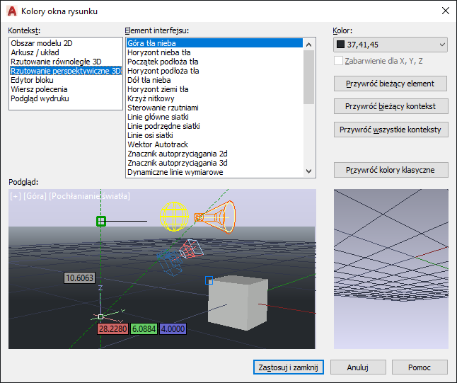 Kontekst oznacza środowisko, na przykład obszar modelu. Elementy interfejsu mogą mieć przypisane różne kolory w zależności od kontekstu. Po wybraniu kontekstu zostanie wyświetlona lista powiązanych elementów. Należy wybrać kontekst, element interfejsu, a następnie kolor.