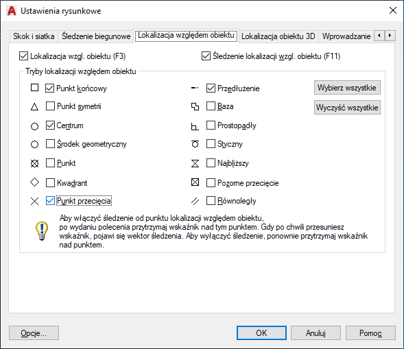 W ustawieniach trybów lokalizacji względem obiektu, nazywanych także „running osnaps”, można określić punkt w dokładnej lokalizacji w obiekcie. Naciskając klawisz TAB, można przejrzeć dostępne opcje.
