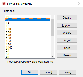 Steruje listą skal dostępnych w przypadku rzutni układu, układów stron i drukowania.