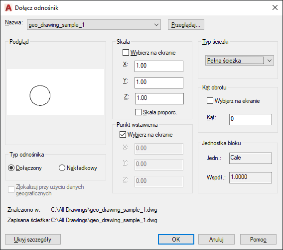 Umożliwia wybranie pełnej (bezwzględnej) ścieżki, ścieżki względnej do pliku odnośnika lub braku ścieżki; nazwa odnośnika (plik musi znajdować się w tym samym folderze co bieżący plik rysunku).