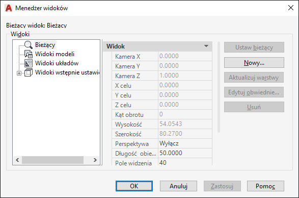 W przypadku widoków modelu i układu wyświetla bieżącą pozycję kamery.