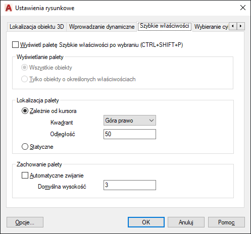 Określa, w którym z czterech kwadrantów w stosunku do kursora ma być wyświetlana paleta Szybkie właściwości. Domyślne położenie to powyżej i na prawo od kursora.