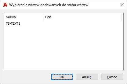 Wyświetla nazwę i opis warstw, które nie zostały dodane do stanu warstw. Wybierz warstwy, które chcesz dodać, a następnie kliknij przycisk OK.