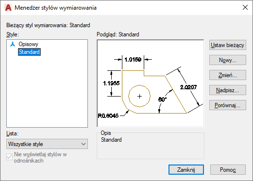 Wyświetla nazwę bieżącego stylu wymiarowania. Domyślny styl wymiarowania to STANDARD. Bieżący styl zostaje zastosowany do tworzonych wymiarów.