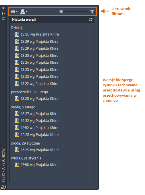 Na palecie Historia rysunku można wyświetlić wersje rysunków, które zostały zapisane na dysku OneDrive oraz w usługach Dropbox i Box. Przy każdorazowym zapisaniu rysunku, który jest przechowywany na koncie w chmurze, tworzona jest i zachowywana poprzednia wersja, tak aby można ją było porównać z wersją bieżącą. Te poprzednie wersje stanowią historię wersji rysunku.