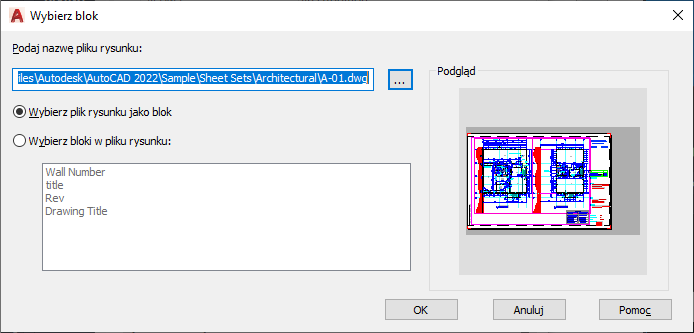 Używa wybranej definicji bloku z określonego pliku rysunku lub pliku szablonu rysunku.