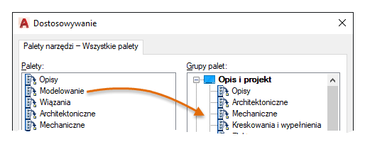 Aby uporządkować palety narzędzi i zmniejszyć liczbę palet widocznych w oknie Palety narzędzi, można zdefiniować i wyświetlać grupy palety narzędzi. Grupa palet narzędzi ogranicza liczbę palet wyświetlanych w oknie Palety narzędzi. Opcja Dostosuj palety wyświetla okno z opcjami pozwalającymi tworzyć i porządkować grupy palet narzędzi.
