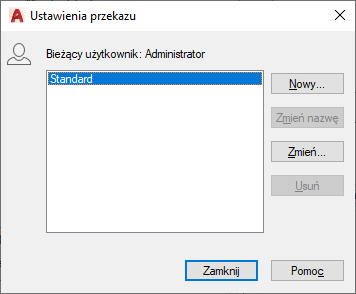 Zmienia nazwę aktualnie wyróżnionego ustawienia przekazu.