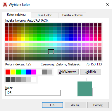 Można wybrać kolor spośród 255 kolorów z indeksu AutoCAD (ACI), kolorów True Color i kolorów palety kolorów, dostępnych na trzech kartach.