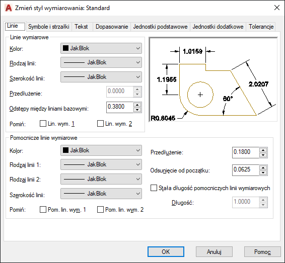 Ustawia format i właściwości dla linii wymiarowych, linii pomocniczych, grotów strzałek i znaczników środków.