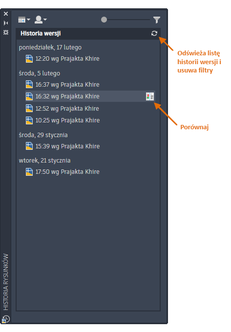 Wskazówka: Szybkim sposobem porównania bieżącej wersji rysunku z poprzednią wersją jest dwukrotne kliknięcie najwyższej pozycji na liście historii wersji.