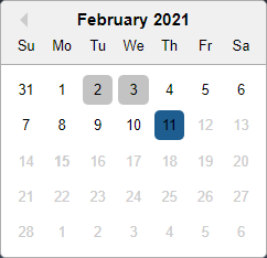 Na przykład jeśli klikniesz filtr kalendarzowy, wybierz co najmniej dwie daty, aby ustalić zakres. Daty początkowo zaznaczone na szaro to daty z co najmniej jedną dostępną zapisaną historią wersji. Daty, które użytkownik określasz, są podświetlone na niebiesko.