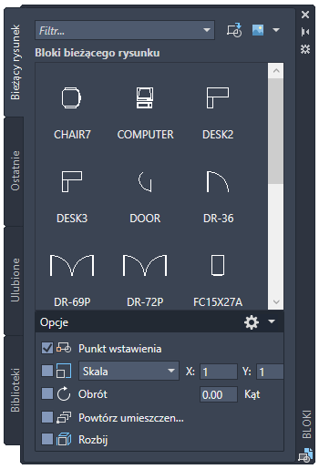 - Kliknięcie bloku i jego umieszczenie w bieżącym rysunku. Ta metoda powoduje zastosowanie ustawień określonych w obszarze Opcje.