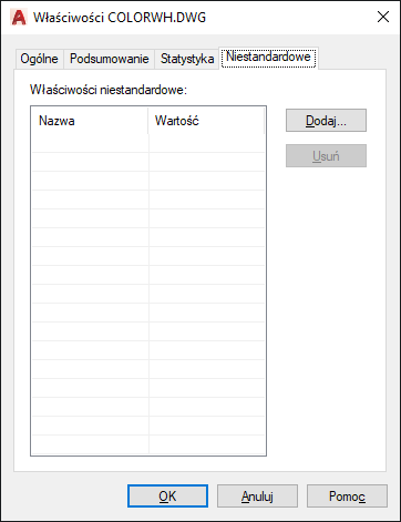 Wyświetla okno dialogowe Dodaj właściwość niestandardową, gdzie można wprowadzić nazwę i wartość nowej właściwości niestandardowej. Nazwa musi być unikalna. Pole wartości można pozostawić puste.