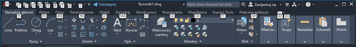 Zamiast urządzenia wskazującego można użyć klawiszy, aby dokonać wyboru z menu, paska narzędzi szybkiego dostępu i wstążki. Aby dowiedzieć się, które klawisze są dostępne w bieżącym obszarze roboczym, naciśnij klawisz Alt.