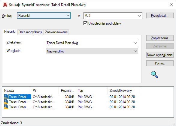 Wyszukuje zasoby takie jak rysunki, wzory kreskowania i bloki.