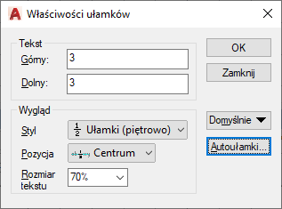 Wyświetla okno dialogowe Właściwości Autoułamków. Opcja Autoułamki od razu ustawia piętrowo znaki numeryczne znajdujące się bezpośrednio przed i za znakami daszka, ukośnika i krzyżyka.