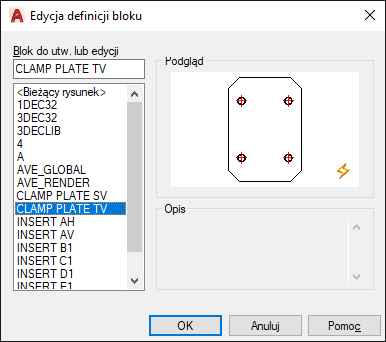 Wyświetla podgląd wybranej definicji bloku. Ikona błyskawicy wskazuje, że jest to definicja bloku dynamicznego.
