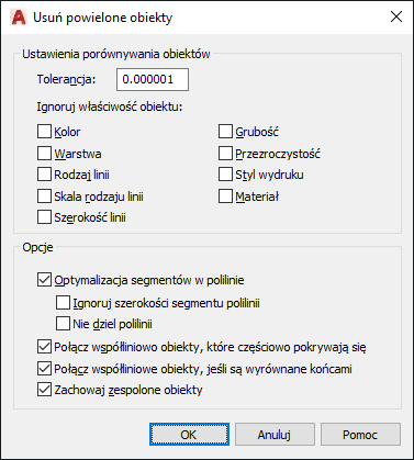 Po wybraniu tej opcji sprawdzane będą poszczególne segmenty linii i łuku w wybranych poliliniach. Powielone wierzchołki i segmenty zostaną usunięte.