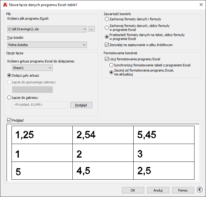 Importuje do rysunku formatowanie określone w oryginalnym pliki XLS, XLSX lub CSV, ale zmiany formatowania nie są uwzględniane w przypadku użycia polecenia AKTUALŁĄCZEDANYCH.