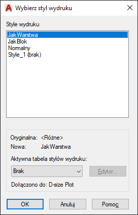 Ustawia tabelę stylów wydruku dołączoną do bieżącego rysunku. Tabela stylów wydruku definiuje style wydruku.