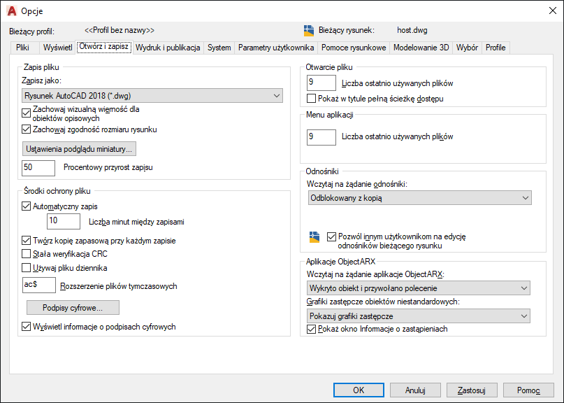 Liczba minut między zapisami: Jeśli opcja Automatyczny zapis jest włączona, określa częstotliwość zapisywania rysunku. (SAVETIME — zmienna systemowa)