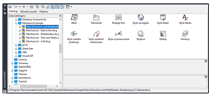 Widok drzewa po lewej stronie umożliwia przeglądanie źródeł zawartości i wyświetlanie jej w obszarze zasobów z prawej strony. Z obszaru zasobów można dodawać elementy do rysunku lub palety narzędzi. Dla wybranych rysunków, bloków, wzorów kreskowania lub odnośników zewnętrznych jest wyświetlany podgląd lub opis.