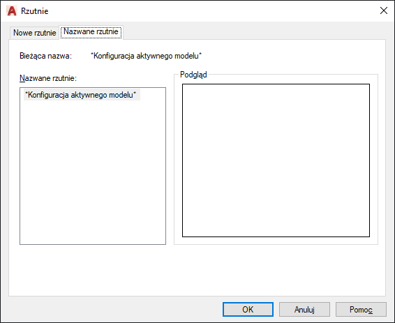 Wyświetla wszystkie zapisane i nazwane konfiguracje rzutni obszaru modelu, które można zastosować w bieżącym układzie. Konfiguracja rzutni układu nie może być zapisana ani nie można jej nadać nazwy.