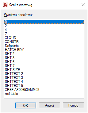 To okno dialogowe określa warstwę, z którą wybrane warstwy są scalane. Scalane warstwy dziedziczą właściwości warstwy wybranej w tym oknie dialogowym.