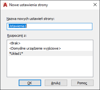 Ustala nazwę dla nowego ustawienia strony, jak również określa ustawienie strony, które zostanie użyte jako cecha początkowa.