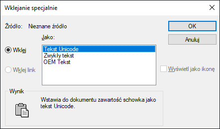 Wstawia obrazek ikony aplikacji zamiast danych. Aby zobaczyć lub zmodyfikować dane, należy dwukrotnie kliknąć ikonę.