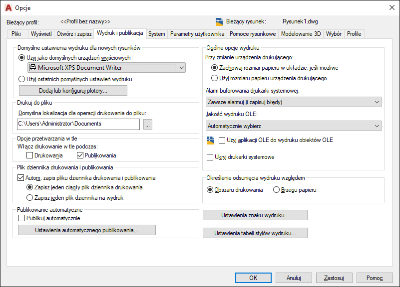 Określa, czy rysunki są publikowane automatycznie w plikach DWF, DWFx lub PDF. Można także określać opcje automatycznego publikowania.